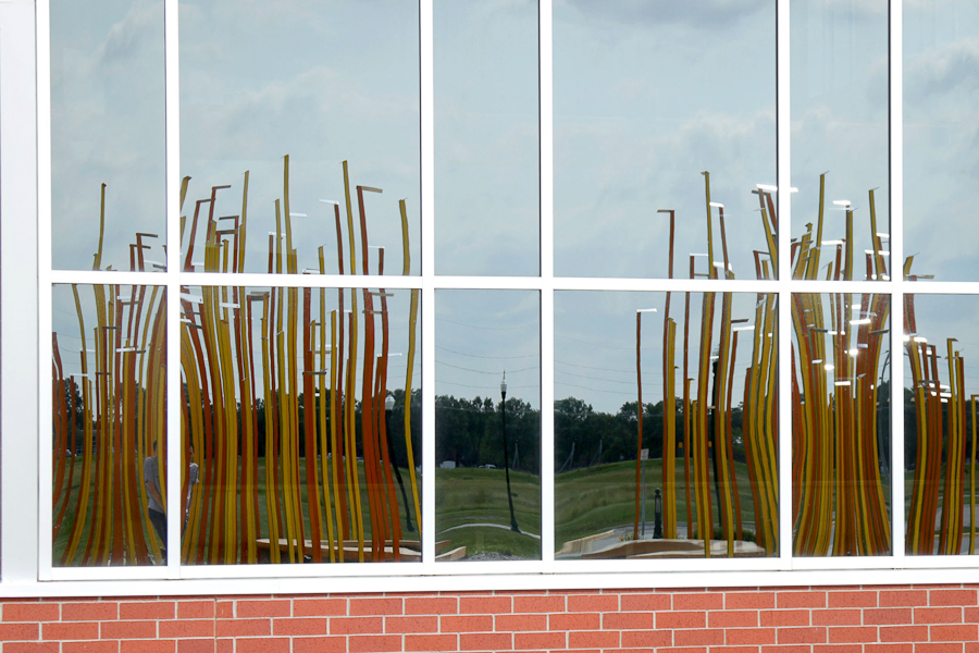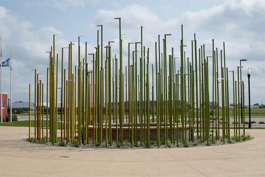 Inspired by the prairie grasses native to the region and the hockey games within the arena, the sculpture is a gathering place on the prairie, like the city itself. Each of the four faces of the steel poles is painted with a different color inspired by the prairie sunlight at different seasons. Polished stainless steel finials cause the accent lighting to disperse, while recalling the form of the hockey sticks. Within the field of narrow steel poles, a seating area frames a stainless steel shape of the Redwood River, cast into the concrete.
